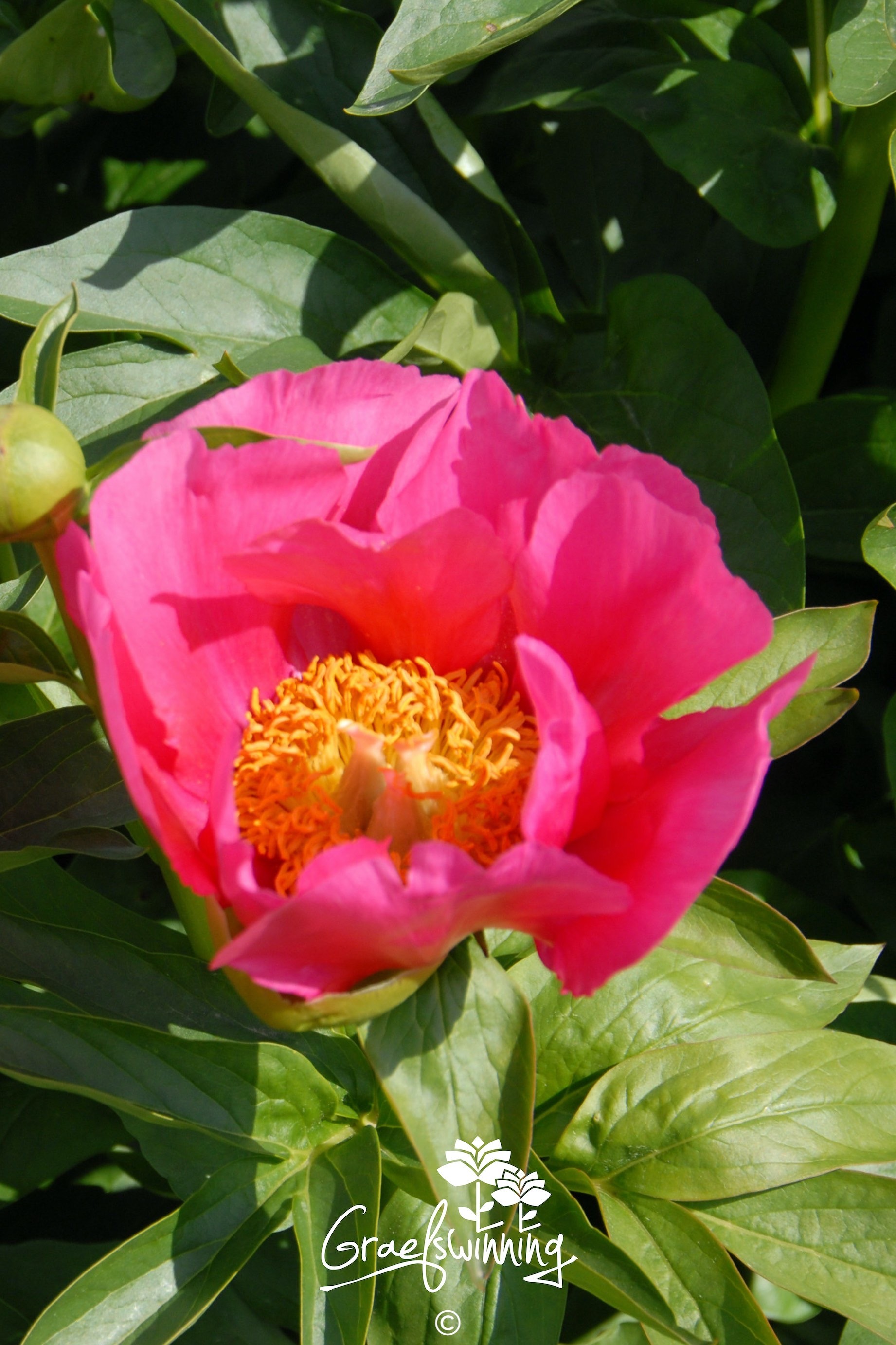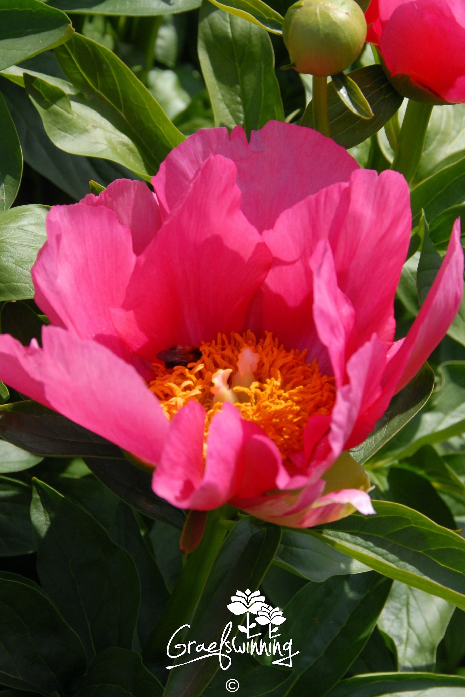 Paeonia hybride herbacée 'Kathryn Ann'. Une pivoine joyeuse à floraison précoce. Les fleurs simples rose fluorescent dominent le feuillage vert foncé. Lorsque les boutons latéraux s'ouvrent, le ton des fleurs principales devient progressivement plus doux et le tout exhibe une palette de tons roses du plus bel effet!